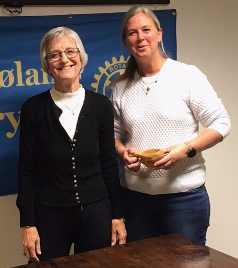 På bildet til høyre ser vi Mariann Ødegård (til høyre) som nettopp har mottatt klubbens (lokalproduserte) kaffekopp som takk for et meget interessant foredrag.