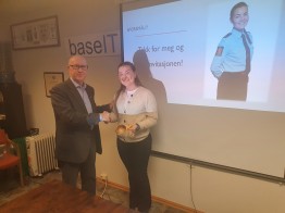 På bildet til venstre overrekker klubbens President, Frank Nebylien, klubbens standard blomstervase til daglig leder i SHIUL, Nina Granerud Fjeld.