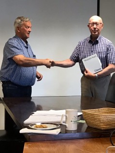 Innkommende President 2016-2017, Hans-Martin Presterud, ønsker President Frank Nebylien lykke til.